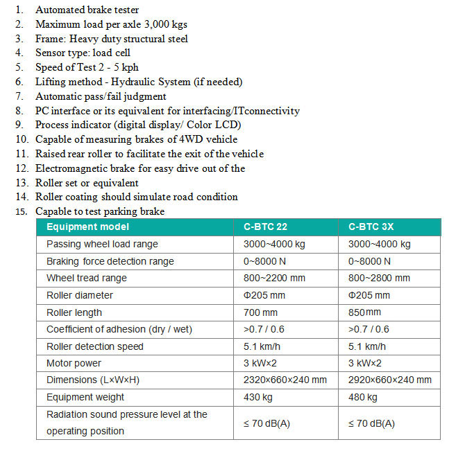 Because of the highly developing of transportation all over the world, the transportation business requires more and more vehicles operating on the road. Therefore, the safety, especially, the one of the commercial heavy duty vehicles become the major issue in the vehicle testing. How to approach to the realest vehicle safety performance test result also becomes the social responsibility to the brake tester manufacturers. In COSBER, the German team develops C-BTT model with hydraulic loading simulation for Heavy duty vehicle to test under loading, which makes the test result more closed to the truth. While it is also equipped with two-speed motors inside to test the light duty vehicles, as well.